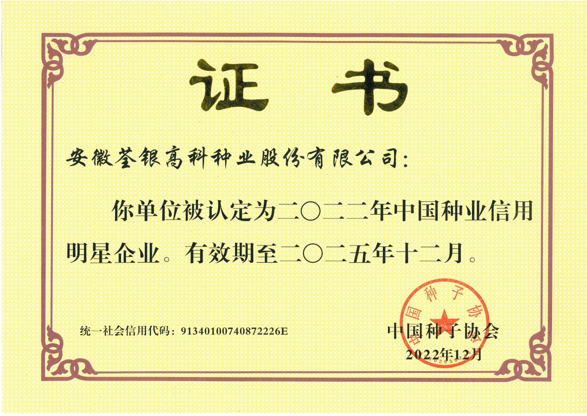 9月,获安徽省农业委员会授予“安徽省诚信种子企业”;