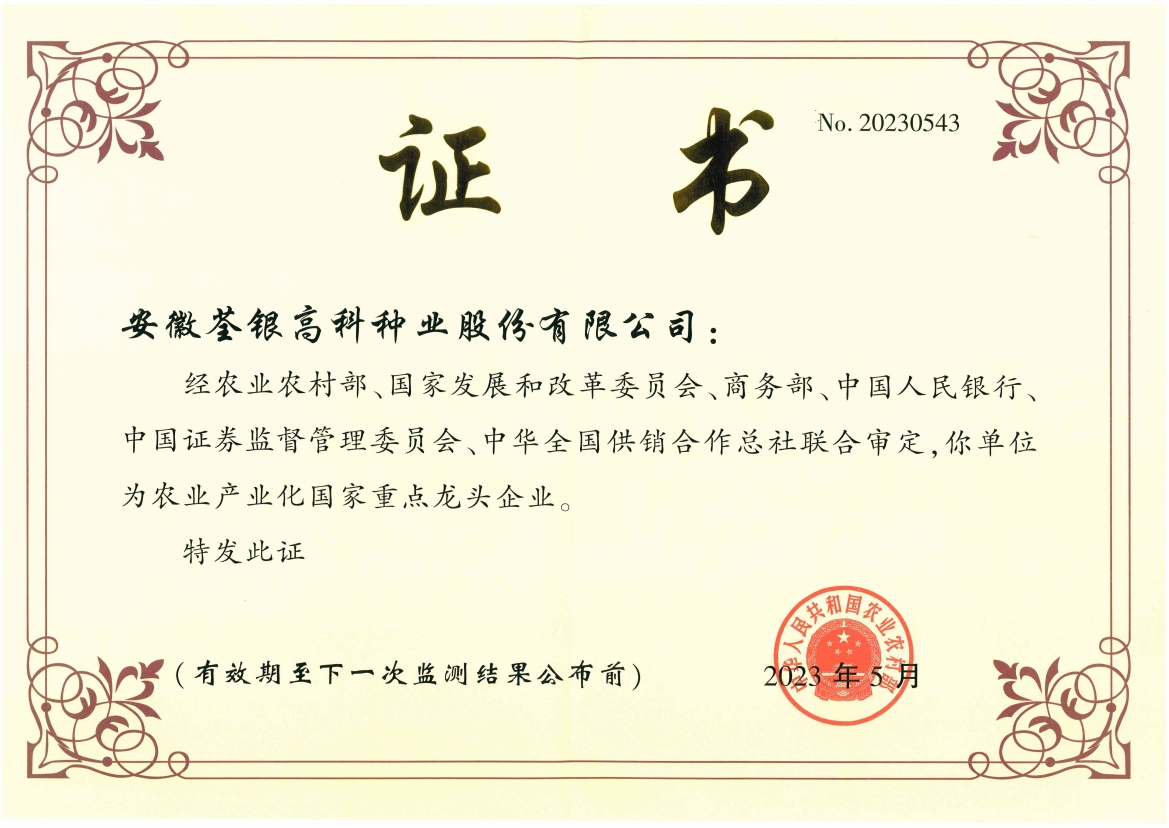2012年9月被认定为农业部首批“育繁推一体化企业”; 2012年12月通过安徽省著名商标复审 ; 2012年12月获得“安徽省农业产业 化省级龙头企业”重新认定 ; 2012年12月获得“安徽省创新型企业”